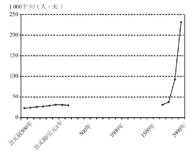 贯穿公元前第一个千年,人均获取能量都有所增长,在1世纪时达到最高点,约为每人每天30 000千卡。按照前现代的标准,达到极高的水平,接近于1700年左右西方核心地带的水平,不过按现代的标准仍算很低,也许连当代美国15%的水平都达不到。图3.6显示了我对古代时期(公元前500~公元200年)和现代时期(1700~2000年)的估计。