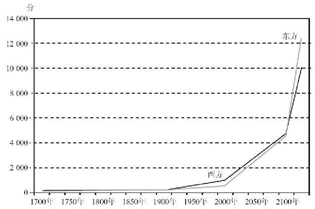 图7.8 未来的趋势?对21世纪东方和西方社会发展分数的预测