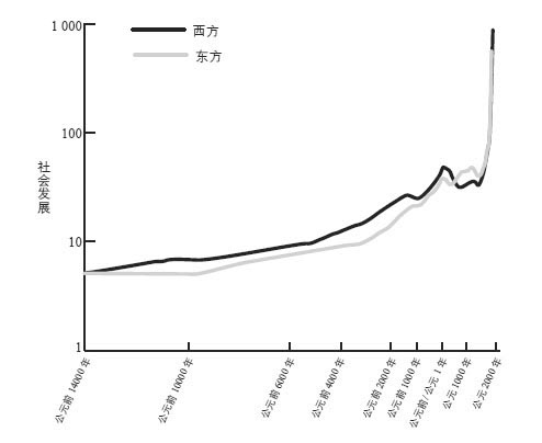 图3-6 对数线性刻度表现的公元前14000~公元2000年的社会发展。这种表现方式十分有效,突显了东西方的相对增长率,以及在1800年以前几千年的变化的重要性