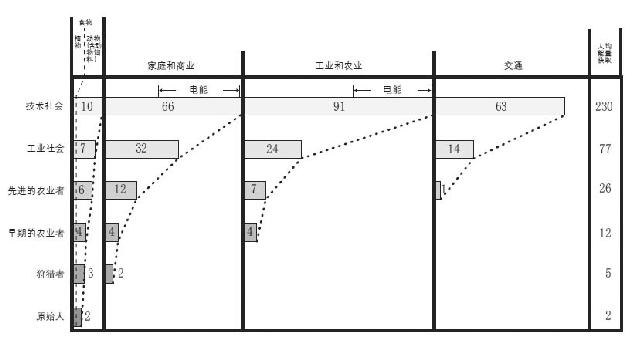 图3-1 数字能量链:地理科学家厄尔·库克关于从能人时代到20世纪70年代美国的日人均能量获取的估计(单位:1000千卡)