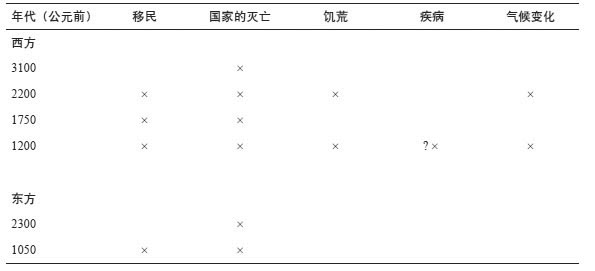 但是,我们不能得出这样的结论:气候变化造成的社会动荡直接导致了社会的瓦解。西方核心地区遭受的旱灾在公元前2200年比在公元前1200年更严重,但是在公元前2200~前2000年间,该地区只是稍有动乱,而在公元前1200~前1000年间,该地区四分五裂。公元前3800年发生的旱灾可能比公元前2200年或者公元前1200年的更严重,但是相对来说,那次旱灾对东方几乎没有影响,事实上还使西方社会向前发展了。