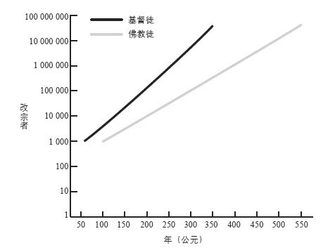 图6-4 统计人数:基督教和中国佛教的不断发展,假定发展速度恒定。纵坐标为对数,与图3-5和图3-6一致,因此发展的平均速度(基督教为平均每年增长3.4%,佛教为平均每年增长2.3%)导致图中出现直线