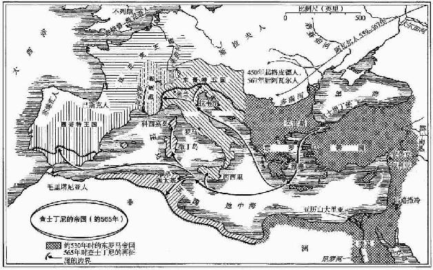 西欧大多数日耳曼王国遇到了同样的问题。几乎所有日耳曼国王都接受了一种不同的、被称为“阿里乌派”的基督教。这使他们在大多数罗马臣民眼里是邪恶的异端。所以皇帝查士丁尼(527~565年在位)有充足的理由期待,如果他能打败日耳曼各个国王的军事力量,那么他就能够使当地大多数人站在自己一边。为此,他在西地中海发动了一系列战役,希冀重建罗马帝国的统一。他只取得了部分成功;在他死后不久,当新的入侵者进犯罗马边界时,他在北非、西班牙和意大利所占领的土地都被迫放弃了。
