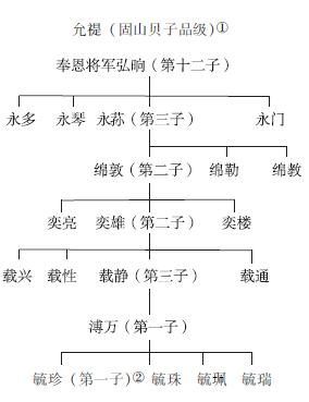 据《清史稿》:“固山贝子品级允禔,圣祖第一子。三十七年三月,封直郡王。三十九年四月,上巡视永定河堤,鸠工疏濬,命允禔总之。雍正十二年卒,世宗命以固山贝子礼殡葬。子弘昉,袭镇国公。卒。子永扬,袭辅国公。坐事,夺爵。高宗以允禔第12子弘晌封奉恩将军,世袭。”