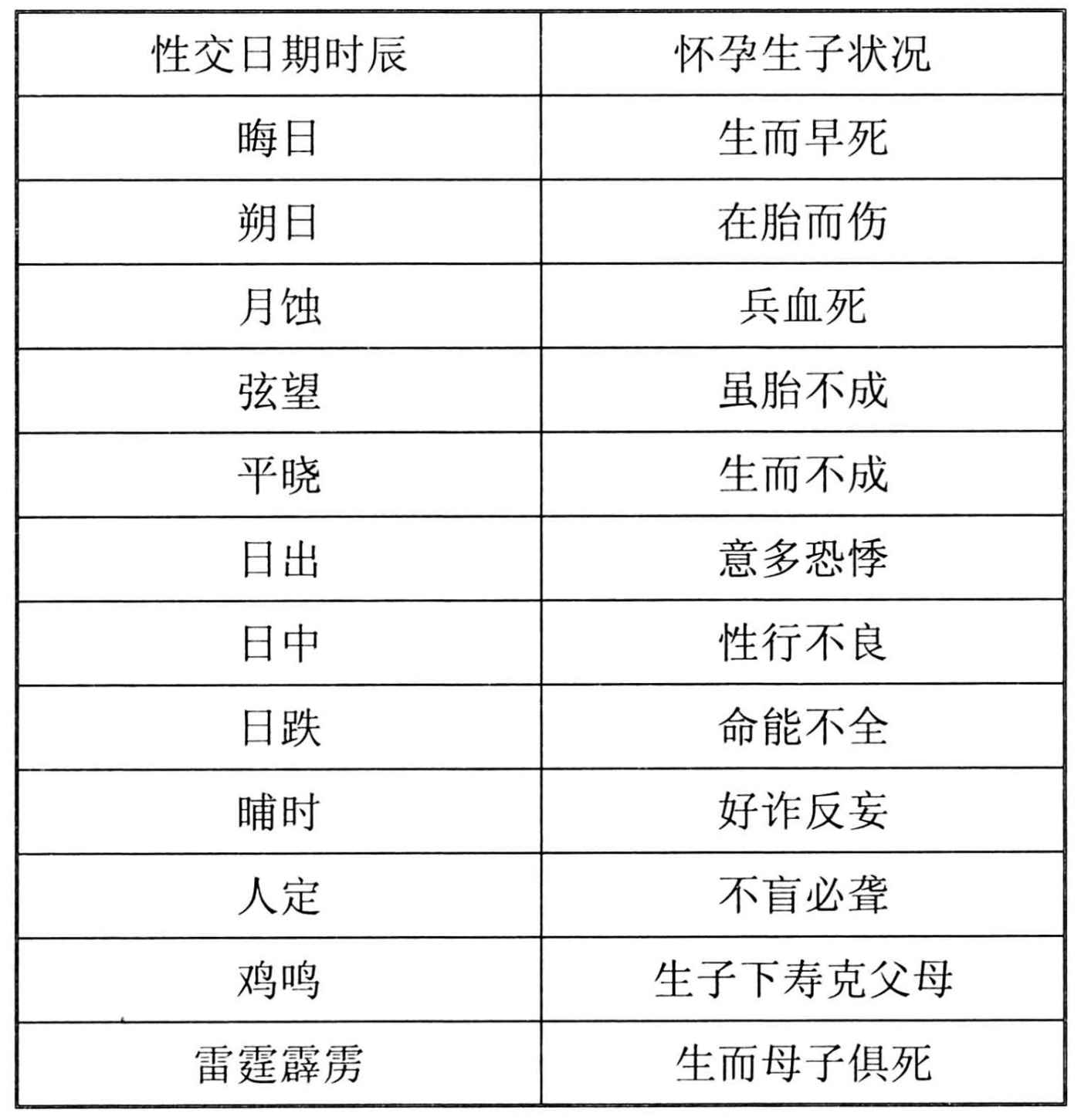 在中国古代那些偏于保守的论述中,性交的目的通常主要是“种子”——让女子怀孕受胎。古人普遍相信,如果性交的日期、时辰等选择不好,就会怀上或生下各种不良的孩子。这在各种房中书和医书中都经常可见,下面是根据《千金翼方》卷十二“养性禁忌”中一部分有关内容整理成的表,以见其说之一斑: