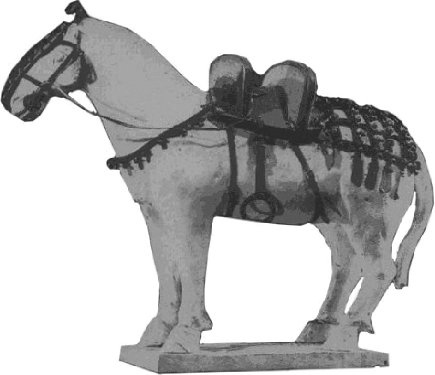 考古材料提供的双马镫普及时代,也是4世纪的东晋十六国时。南京象山东晋墓7号墓出土一尊陶马俑,“两侧有镫”,应是双马镫的较早代表。[28]1954年西安草场坡1号墓出土了一组铠马陶俑,明确塑有双马镫造型,以前考古学者认为是北朝墓葬,现在逐渐改为十六国的前后秦时期。[29]至于较早的双马镫实物,则是辽宁北票出土的北燕太平七年(415年)冯素弗墓。[30]