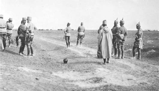 九月十日,康拉德(左)和弗里德里希大公(右)首度走访前线(这场战争期间他们只去了前线三次)。照片中,他们站在格鲁代克阵地里,听着战斗声,未拿定主意。他们的德国武官站在他们后面,礼貌性隔着一段距离。