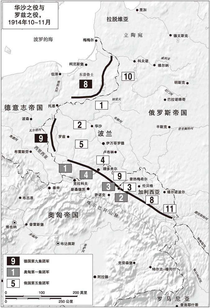 维也纳认为柏林可能拿奥地利领土换取德国人在比利时、法国想取得的领土。因此,霍伦赫把他的外交任务称作在柏林“营造某种思想倾向”,让德国人认为可“借由在东边的彻底胜利,借由彻底消灭俄国,保障德国的未来”。[12]那不是柏林的思想倾向,但德国人的确认识到,除了攻入波兰、恢复奥地利信心、击退俄国大军,几乎无别的路可走。如果坚守克拉科夫与喀尔巴阡山脉之间狭长地带的奥军被赶到山脉另一边,俄军乘胜追击进入匈牙利,那么德国的西里西亚将受到侧翼包抄,很可能会不保。德国也将失去其唯一的欧洲盟邦,使柏林没有奥军,乃至没有“同盟”这个遮羞布来掩饰其庞然野心。九月中旬,德皇和其将领同意,“直接援助奥地利,乃是现今政治上所必需”。[13]