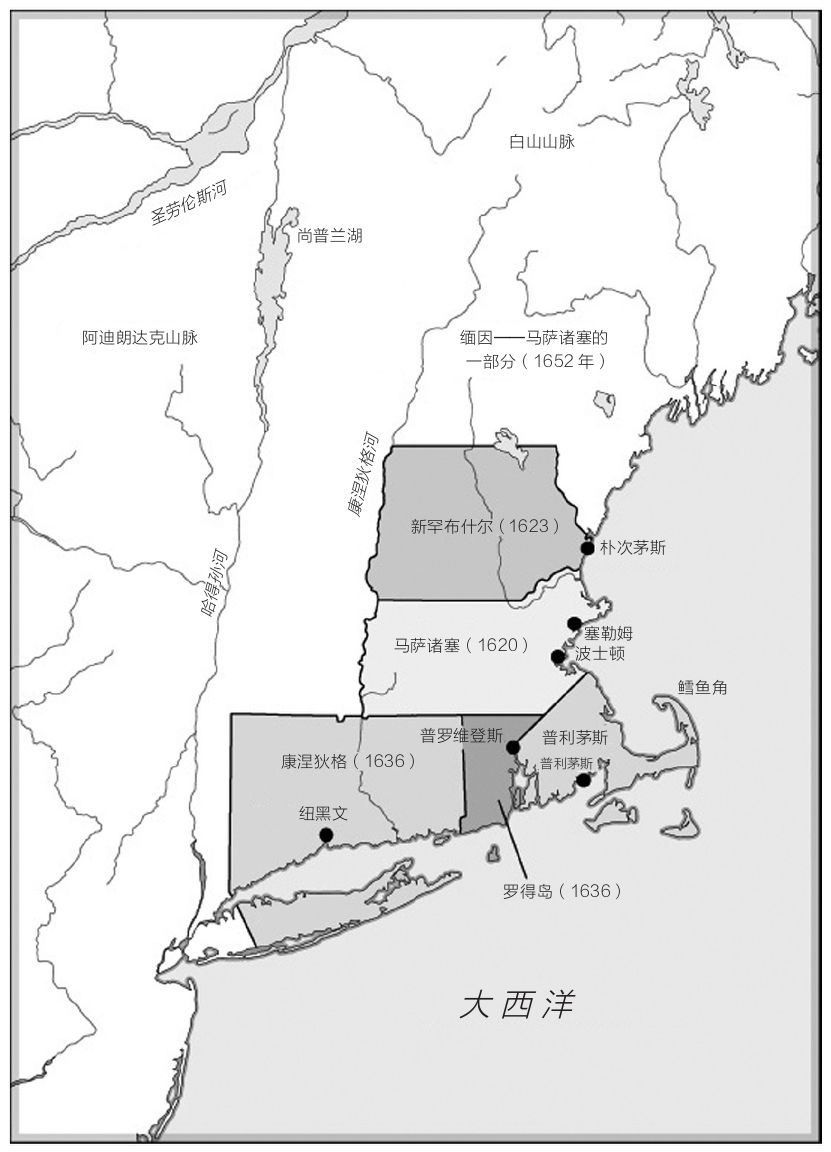 普利茅斯传来的报告鼓舞了另一群英国本土的清教徒,他们对查理一世治理下的英国教会感到绝望,在萨福克镇律师、地主约翰·温斯罗普(John Winthrop)的领导下,决定放弃眼前腐败不堪的天主教旧世界,移民到新的圣经之国。在另一家商业公司,也就是成立于1629年的马萨诸塞湾公司的资助下,这些清教徒从英国出发,驶向马萨诸塞。美洲历史上所谓的“大迁移”(1629—1642年)也自此开始。这些人只是移民的先锋队,在接下来的十年中,有超过两万名清教徒来到美洲,形成了五个主要的殖民地:普利茅斯殖民地、马萨诸塞殖民地、罗得岛殖民地、纽黑文殖民地和康涅狄格殖民地。在美国建国时最初的13个州中,有3个州来源于这些殖民地(地图1)。
