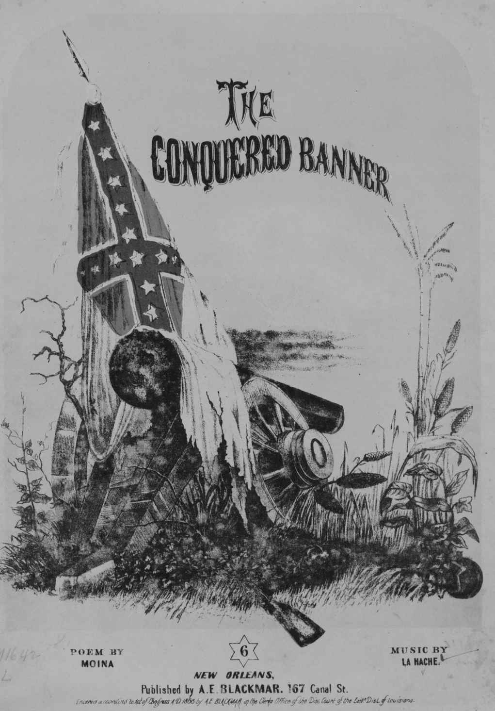 图32 《被征服的旗帜》(新奥尔良:A.E.布莱克默,1866年)。哀悼邦联军战败的乐谱封面。这幅图片描绘了一面落在大炮上的邦联旗帜,旗帜周围长满了野草。题目借用了“享誉邦联的诗人”艾布拉姆·瑞安同年发表的诗歌。瑞安在《被征服的旗帜》这首诗中写道:“叠起那面旗帜,因为它已疲惫不堪/它的四边凄凉地垂下/叠起它、折起它——它胜过一切/因为没有一个人去挥动它/没有一把剑去拯救它……叠起那面旗帜,温柔的、缓慢的/温和地对待它——它无比神圣/因为它遮盖着死去的人们/不要触摸它——也绝不打开它/就让它在那里低垂、永远被妥善地放置/因为它的人民已经没有了希望。”由美国国会图书馆印刷品与照片部友情提供(LC-USZ62-91833)。