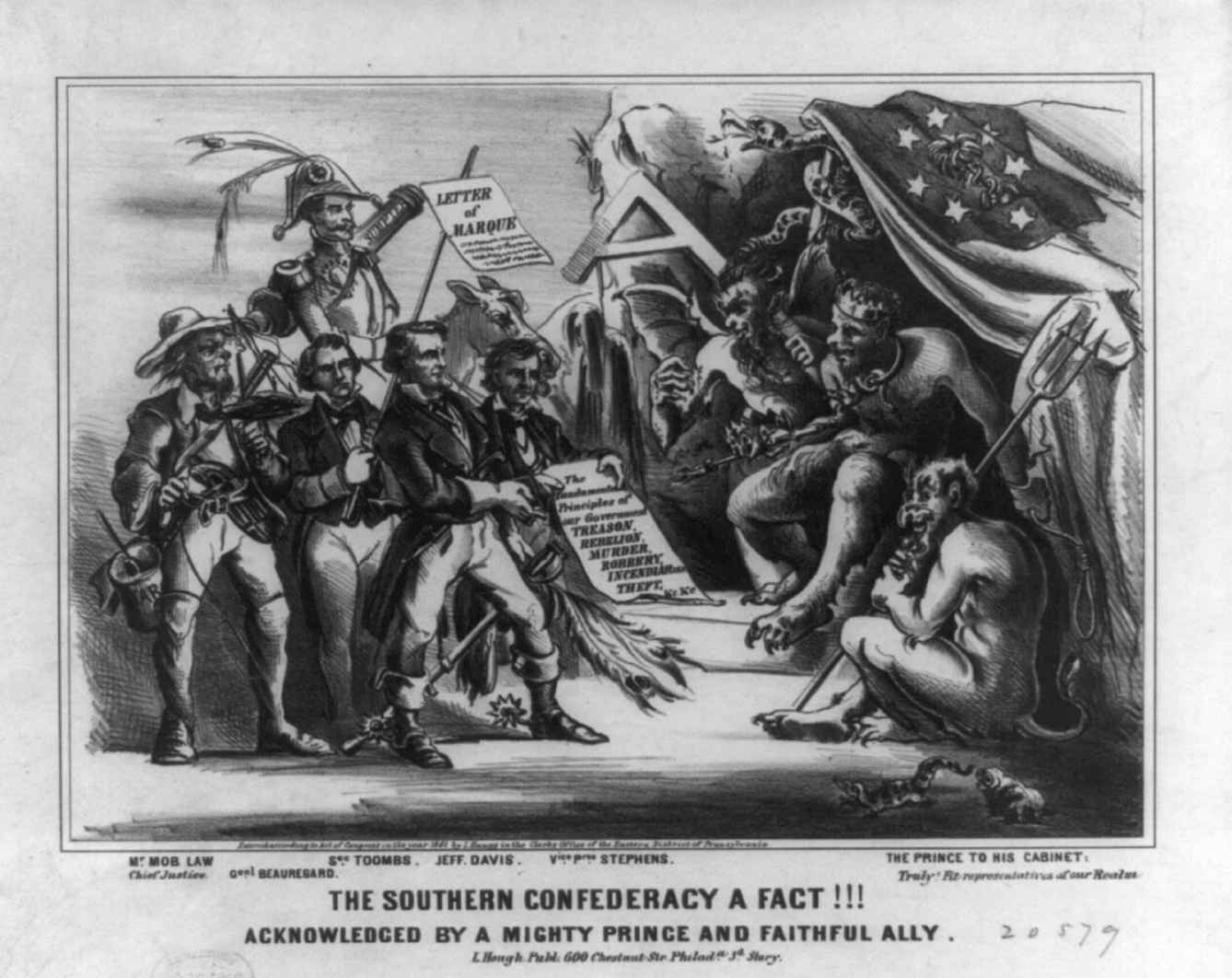图29 《南方邦联的真相!!!来自一位有权势的贵族和他忠诚的同盟们的陈述》(费城,1861)。与上一幅漫画不同,这幅漫画毫无疑问在批判,实际上是在谴责画中的邦联在与撒旦为盟。左边的人物是“大法官暴民法先生”,他背着一罐沥青(代表了南方的联邦支持者所遭受的酷刑,即先在他们身上倒上沥青,再贴上羽毛);邦联国务卿罗伯特·图姆斯手持一份“许可令”(即一份政府批准没收外国财产的证明,在这幅图上,它特指邦联在1861年逮捕福特·普拉斯基的许可令);邦联总统杰弗逊·戴维斯和副总统亚历山大·斯蒂芬斯手持一份名为“我们政府的根本原则”的文件,其中包括了叛国、叛乱、谋杀、抢劫、防火和偷窃。众人身后、骑在马背上的人物是G.T.博雷加德将军。他在1861年4月让查尔斯顿海港萨姆特堡向邦联投降。撒旦和他的属下坐在南卡罗来纳州的棕榈旗下,宣称邦联“是我们的王国名副其实的、恰当的代表”。由美国国会图书馆印刷品与照片部友情提供(LC-USZ62-89624)。