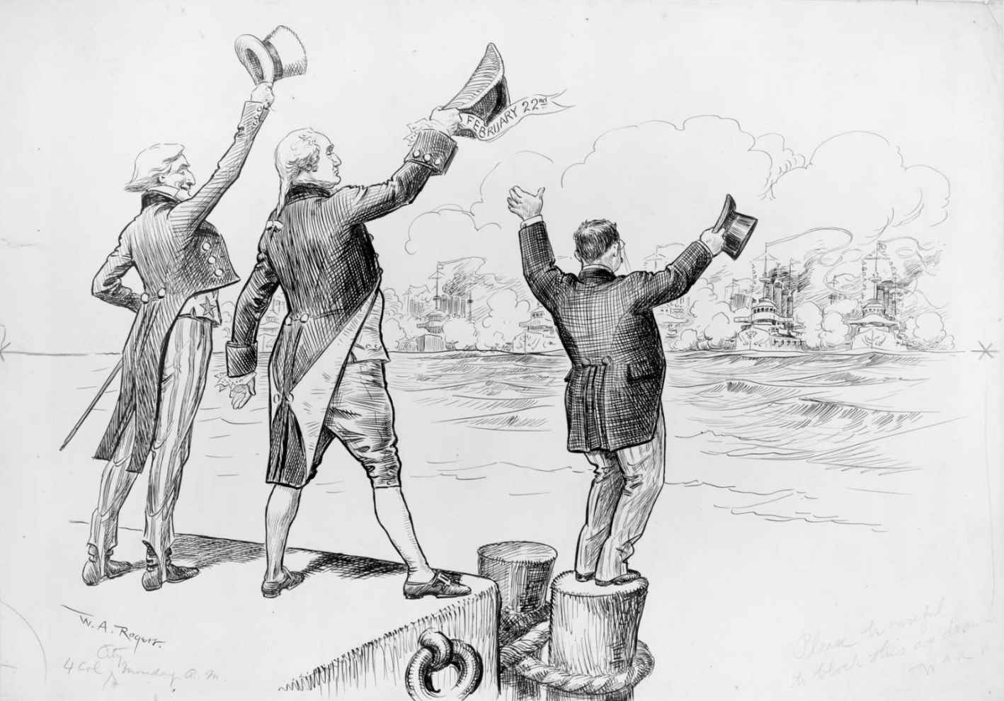 图47 《欢迎回家》(威廉·艾伦·罗杰斯,1909年)。这幅极具爱国色彩的漫画登载在1909年2月22日(华盛顿帽子上的日期)的《纽约先驱报》上。它描绘了(从左向右)“山姆大叔”、乔治·华盛顿和西奥多·罗斯福迎接大白舰队在完成环球旅行后驶回位于汉普顿锚地海军造船厂的场景。由美国国会图书馆印刷品与照片部友情提供(LC-USZ62-136026)。