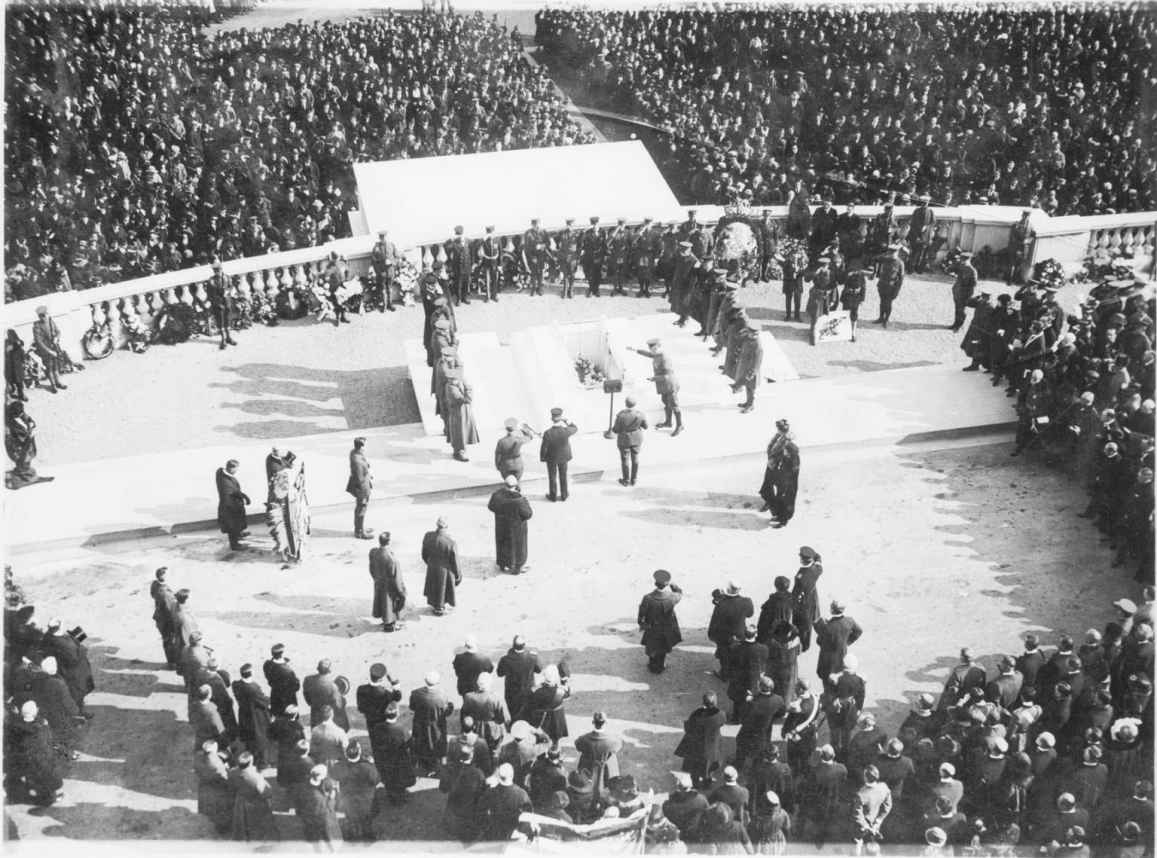1921年11月9日,星期三,持续的降雨和灰蒙蒙的天空让人难以看清波托马克河上正在溯河航行的海军奥林匹亚号。这艘船之前是海军准将乔治·杜威(George Dewey)的旗舰,由于在美西战争期间马尼拉湾战役中的表现而名声大噪。这一次,它将一位在第一次世界大战中牺牲的无名美国士兵的遗体运回国,这也是它在退役前的最后几次行动之一。在一片灰茫之中,旁观的群众不大看得清船的轮廓,却还是能够根据奥林匹亚号经过时礼炮的鸣响声判断出船的位置。船上运送的灵柩将会停放在华盛顿国会大厦的圆形大厅供公众瞻仰,夜里也会有仪仗队守灵。据媒体报道,遗体抵达时举行了简短的典礼,出席人员仅有总统沃伦·哈定及其夫人、潘兴将军以及其他几位军队高官。第二天,阴云散去,在官方正式敬献花圈之后,人群开始涌来凭吊。据《纽约时报》报道,前来凭吊的人群真正是一条“人性的河流,美国的男女老少,那些继承传统的美国人,那些上帝的选民”,“是这个国家流动的生命线——一条缓慢但势不可挡的人性的湍流,涌来为在法国阵亡的美国士兵的英勇作证”。