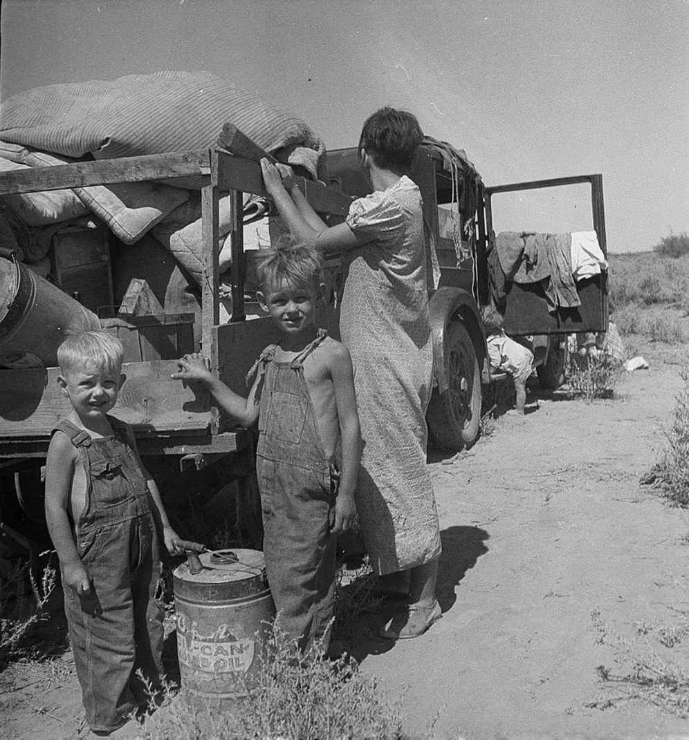 这些各式各样、数量繁多的项目表明政府在大胆尝试实现经济复苏,但这些做法也招致了批评。反对者将这些机构称为“字母表机构”(他们还仿照儿童意大利面食的名字给那些新政项目取名为“字母表汤”),而它们在实现经济和社会稳定上所取得的成果也良莠不齐。但这并不完全是那些机构自身的问题,因为天意也没有帮助新政。持续的干旱(在某些地区持续了将近十年)带来剧烈的沙尘暴,将大平原变成了“风沙侵蚀区”,这也许最能体现出美国经济大萧条时期的荒废状态。风沙侵蚀在得克萨斯州和俄克拉荷马州狭长地带最为严重,并一直延伸到新墨西哥州、堪萨斯州和科罗拉多州。这些地区的人口得不到救济,成了自己土地上的移民工人。在多罗西娅·兰格(Dorothea Lange)等摄影师的镜头里,以及约翰·斯坦贝克(John Steinbeck)等作家的文学作品中[斯坦贝克1939年的小说《愤怒的葡萄》(The Grapes of Wrath)讲述了从俄克拉荷马州被逐出的一家人,是对大萧条时期的文学描绘中最出名的一部作品],这些人的困境成为美国20世纪30年代大范围灾难的标志。
