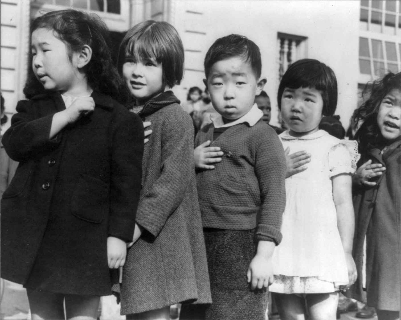 图58 旧金山韦尔公立学校的一年级学生向国旗宣誓效忠(照片由多罗西娅·兰格于1942年4月拍摄)。他们中的很多人后来都被安置到位于亚利桑那、科罗拉多、怀俄明、阿肯色等州的“集中营”,另一些人被流放到印第安保留地。当然,这里的“集中营”是指罗斯福当时所称的“重新安置”中心,而不是二战之后为人们所普遍理解的那个含义。多罗西娅·兰格作为战时人员调动管理局的员工拍摄了这张照片,但是战时人员调动管理局对它所传达的信息十分恼怒,于是没收了这张照片和兰格在1942年拍摄的关于加利福尼亚州日裔美国人经历的其他作品。由美国国会图书馆印刷品与照片部友情提供(LC-USZ62-42810)。
