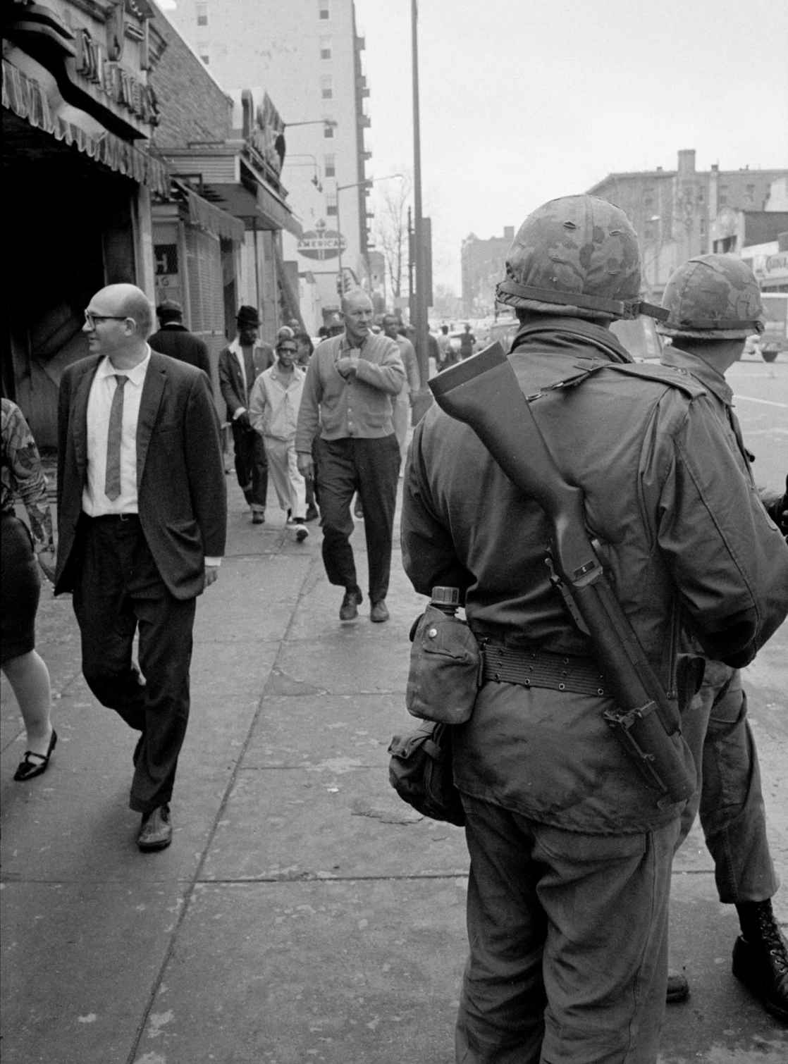 图65 《1968年华盛顿暴乱发生之后》(沃伦·莱弗勒于1968年4月8日拍摄)。华盛顿国民警卫队于华盛顿街头巡逻。1968年4月4日,马丁·路德·金遇刺后,全国各地爆发了为期5天的种族暴乱。但其实在1968年之前,在许多城市的街头已经正常有武装力量巡逻。尤其是在1967年的“不满之夏”之后,成立了国家民事骚乱专项顾问委员会(克纳委员会)。由美国国会图书馆印刷品与照片部友情提供(LC-DIG-ppmsca-19734)。