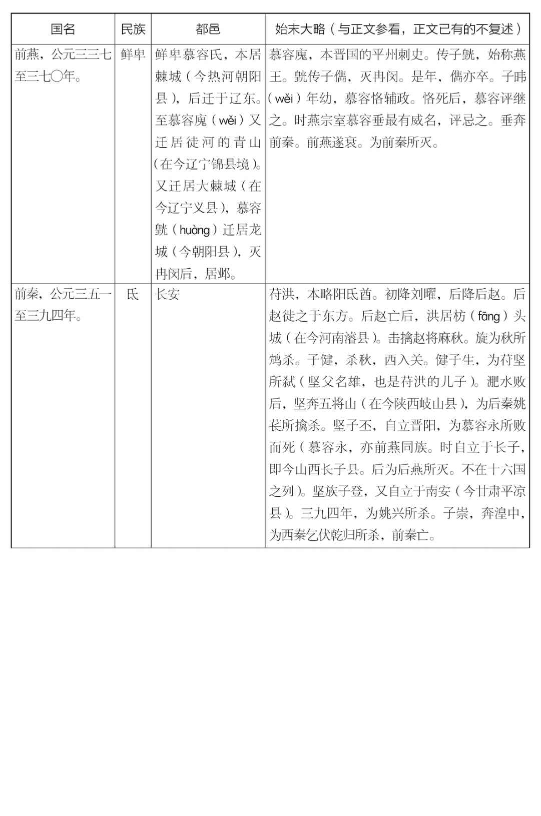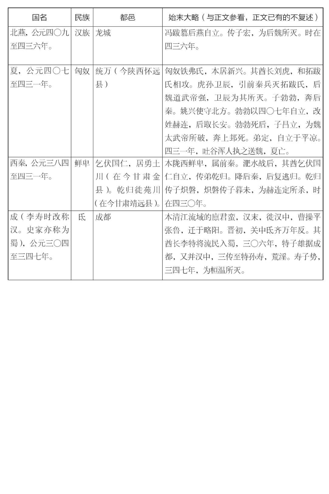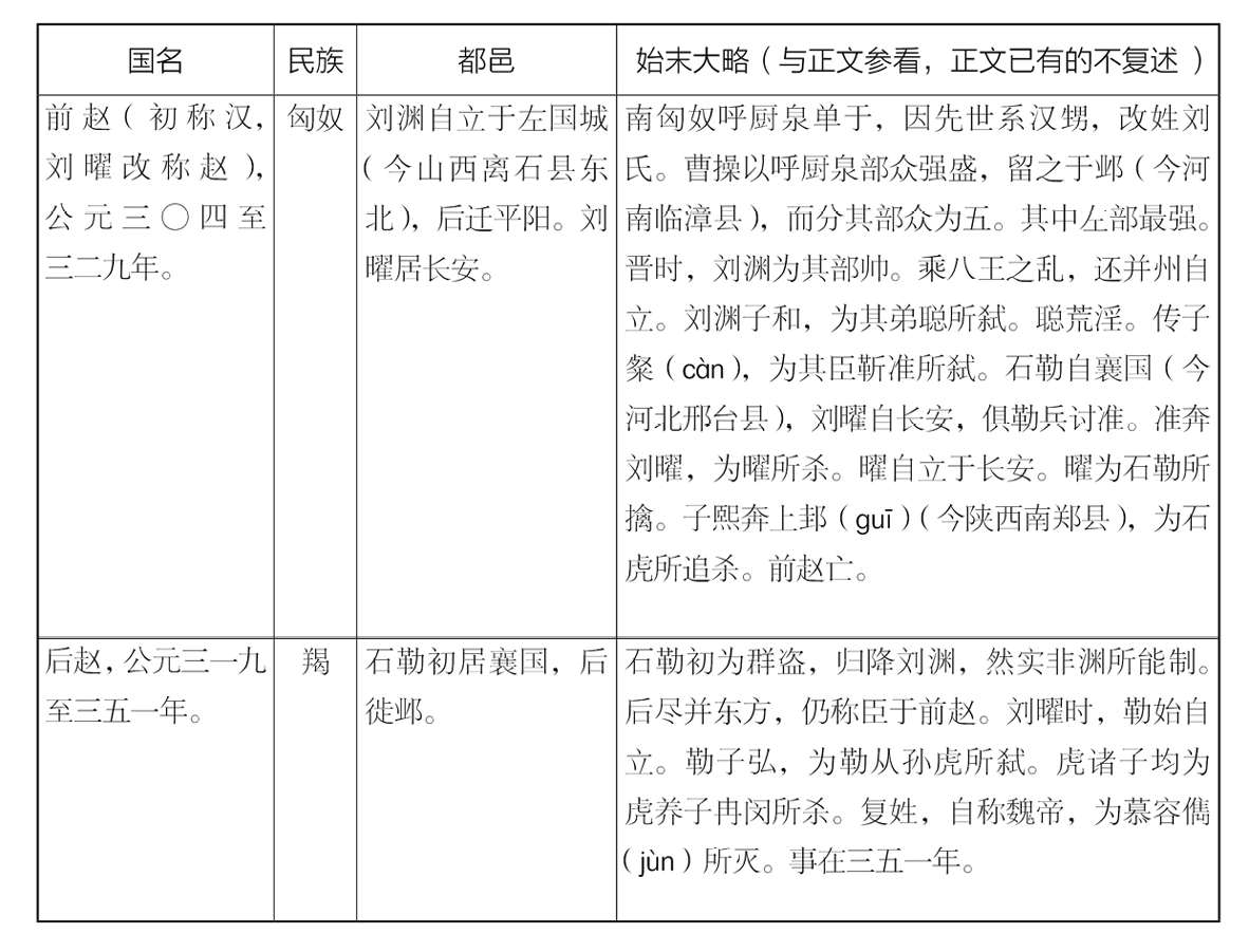 五胡十六国的事情,是很繁杂的。以上只提挈(qiè)得一个大纲,现在补列一张简表于下,请诸位参看。