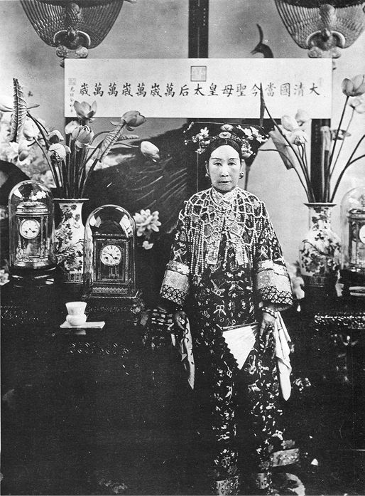 德龄公主在《清宫二年记》中这样记录初见到的慈禧太后,“我们一眼就看见一位老太太,穿的黄缎袍上绣满了大朵的红牡丹。珠宝挂满了太后的冕,两旁各有珠花,左边有一串珠络,中央有一只最纯粹的美玉制成的凤。绣袍外面是披肩。我从来没有看到过比这更华丽、更珍贵的东西。这是一个渔网形的披肩,由三千五百粒珍珠做成,粒粒如鸟卵般大,又圆又光,而且都是一样的颜色和大小,边缘又镶着美玉的璎珞。此外,太后还戴着两副珠镯、一副玉镯和几只宝石戒指。在右手的中指和小指上,戴着三英寸长的金护指,左手两个指头上戴着同样长的玉护指。鞋上也有珠络,中间镶着各色的宝石。”通过这样的记述,我们可以想象到作为当时紫禁城中最尊贵而有权势的女人是什么装扮和模样。