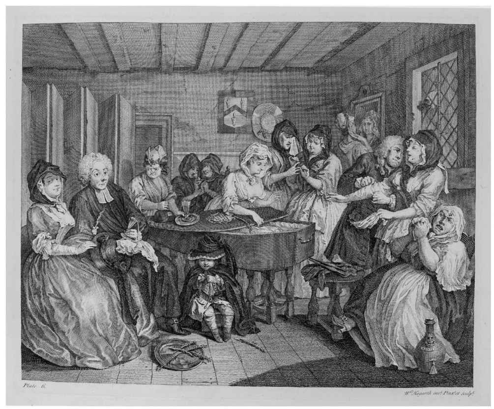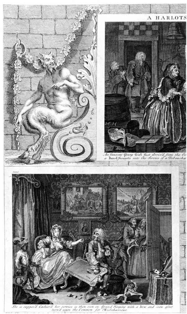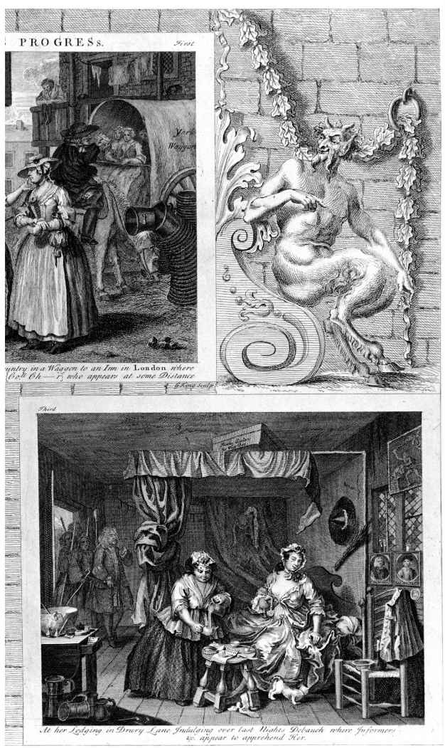 可购买这些画的人,未必将其视为次等的赝品——实际上,剽窃品往往会通过在每幅画下附上一首题诗以提供附加价值。任何口袋里有一先令或两先令的人,都可以从众多版本讲述其故事的小册子中购买一本,这些书往往会印上小尺寸的套画。此外,《一个妓女的历程》还以哑剧、歌剧、喜剧及其他戏剧的形式存在着,1732年后仍经久不衰。该套画同样在其他视觉媒介中得到完整或部分复制,在夫人的扇子上,在茶杯、浅碟及其他瓷器与锡器之上(见彩图11)。