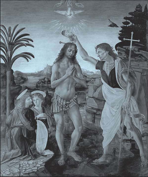 委罗基奥完成了整体构图,而达·芬奇领到的任务是画一些背景和左边的那位小天使(最左边只露侧脸的小天使)。但就是左边的这个惟妙惟肖的小天使,展现出了全画都没有的一种灵性。在达·芬奇创作完这幅画后,委罗基奥就表示再也没办法教他绘画了,而是将他介绍给另一位有名的绘画大师。不仅如此,委罗基奥之后也表示不会再画画了,转攻雕塑。