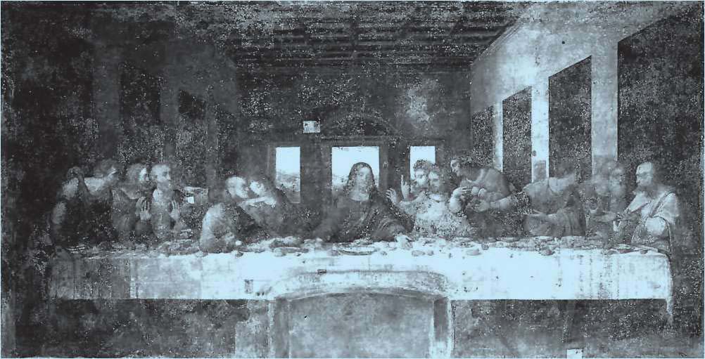 这幅画是达·芬奇画在教堂上的壁画,虽然经过多次修复,但依旧损毁严重——事实上,这幅画能保存下来就已经是奇迹了