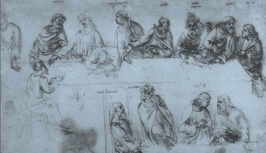 达·芬奇关于《最后的晚餐》的大量习作被藏于温莎图书馆和威尼斯,他给每个人物形象都找了现实中的模特,甚至为每一双手、每一件衣袖都做了很多草稿笔记