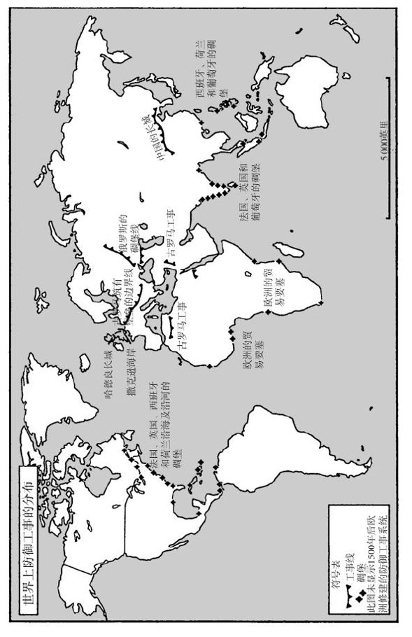 到公元前第一个千年,在地球的温带地区,防御工事已经是星罗棋布。中国早期的城镇是没有围墙的。黄土平原上缺少树木,所以就连建造城墙的基本材料都付诸阙如。但是,商朝建立了最早的中央政权时(约公元前1500—前1000年),中国出现了夯土城墙;有意思的是,商朝的表意文字中代表城的符号“邑”是一个堡垒加一个跪伏的人形,说明碉堡在中国和在别的地方一样,既是防御工事,又有控制社会之用。在古希腊,米诺斯文明崩溃后的黑暗时代结束后,新兴的城邦自然而然地高筑城墙;位于现代意大利的城邦也如法炮制,古罗马当然也是一样。到公元前4世纪,亚历山大大帝挥师穿过波斯去征服印度时,只要在有居民点的地方作战,军师们就会预料那些地方一定有据点阻拦大军的前进。