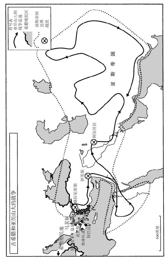 腓力二世18岁的儿子亚历山大参加了喀罗尼亚战役,他带领左翼的骑兵奋勇作战,给了敌人以决定性的打击。两年后,亚历山大即位;时至今日,传记作家仍然就他是否参与了弑杀腓力二世的阴谋一事猜测不休。亚历山大即位后,维持了马其顿的既有政策。事实上,他对“征讨”波斯比他的父亲还要起劲儿。他彻底征服了马其顿北面边界上与腓力二世作对的宿敌后,又镇压了底比斯的叛乱,然后点起马其顿的大军,再加上由因希腊战争结束而无所事事的大批士兵组成雇佣军,在公元前334年春天渡海到达亚洲,开始了推翻当时的波斯皇帝大流士三世的战争。这是一项大胆得令人咋舌的行动。波斯占领了中东所有旧帝国的领土,版图所及不仅有波斯本土,还囊括了美索不达米亚、埃及、叙利亚和希腊殖民地所在的小亚细亚。波斯军队的中心力量虽然仍然是战车部队,但也包括重装骑兵和人数众多的希腊雇佣步兵。