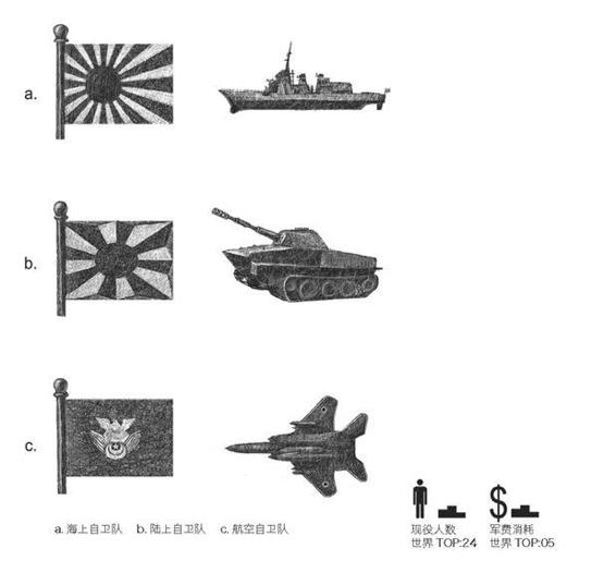 总司令:内阁总理大臣安倍晋三现役人数:247746(世界排名第24 名)军费预算: 占当年GDP 的1% 左右
