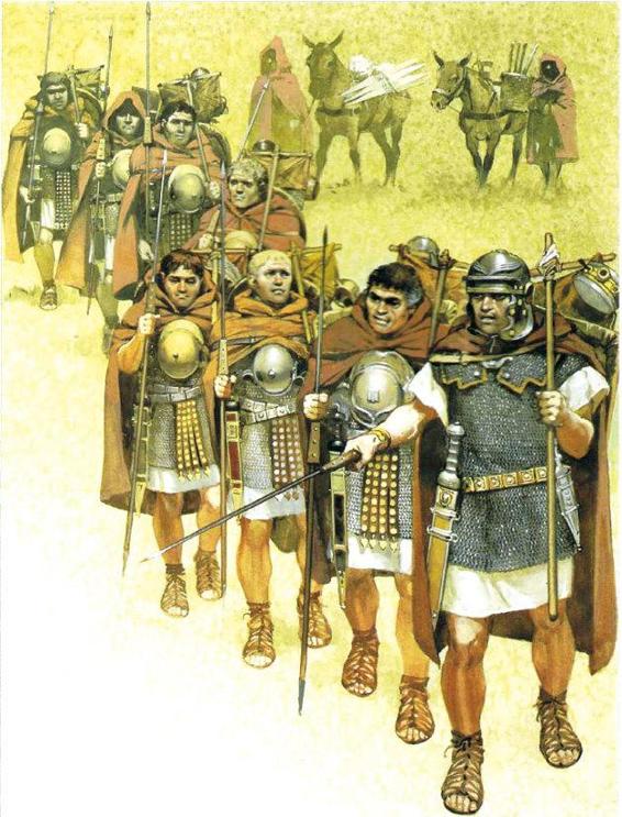 ◎ 一支行军中的帝国军团。由于需要在行军中背负极重的行囊,马略改革后的军团士兵自嘲为“马略之骡”,这种通过强化士兵负重,减少非战斗人员比例的情况在另一些古代军队中的职业化先驱者中也有体现。
