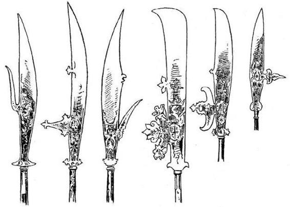 长柄刀、长戟和长柄斧均为欧洲的舶来品。长柄刀的外形类似于中国的青龙偃月刀:单刃刀身连接着一根长形木柄。一般而言,形状像斧头的刀身长18英寸(45厘米)左右,被固定在木柄(通常长2米左右)上。少数长柄刀的刀身背面是钩子状的,专门用于对付骑兵,这种长柄刀被称为“钩镰刀”。长柄刀可以兼作一支铁头木棒、一支短矛、一支斧形枪,或一支长戟,英国人西维尔认为它是长兵器中的王者。