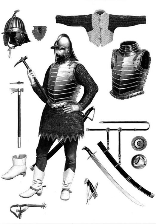 至于小队扈从,理论上也应该是顶盔掼甲装备齐全,但是他们的装备往往要比同伴们差得多。头盔方面,他们一般配备的是简单粗糙的四周有檐的碟形头盔(Kapalin),通常是大批量简单生产的产品,而甲胄也往往是草草搭配一身了事。事实上能有一身盔甲的扈从都已经算是运气不错了,很多同伴不能给自己的扈从装备全套甲胄,因此有的扈从只能带着皮帽,或者穿着长袍投入战斗。不过也有同伴选择减少小队的人数,以保证剩下的扈从能够有较好的装备。