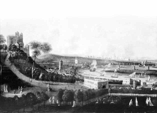 在格林尼治俯瞰德特福德(Deptford)的照片,由老简·格蕾菲尔(JanGriffier)画于17世纪末。自左向右分别是:英国皇家天文台、圣阿尔菲奇大教堂、英女王官邸和海军医院第一街区。(国家海事博物馆,BHC1817)