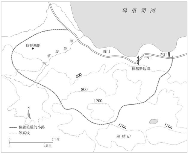 随后这一万人绝尘而去。他们的路线从热门以西几英里处开始,此地也在特拉基斯和阿索波斯山谷以西。36登山之前还可以看到平原上开始点燃营火,但不久营地就消失了。在厄菲阿尔特的带领下,人们很快找到了小路,此时天空中万里无云,卡尔涅亚节日时的满月令8月天空中明亮的星星都显得黯淡。在月色中,不死战士经过了几个小时的行军,绕过了特拉基斯峭壁上的辽阔高原,进入一条峡谷,然后跨越了阿索波斯河,沿着河对岸的路走向更深的山谷。到目前为止,这些人并没有被随身的武器和装甲累倒,反而还能够继续前进。大约又走了几个小时,穿过橡树和松树林带后,他们到达了另外一片辽阔原野的边缘,对面是更多的树木,间或有开阔的草地,小路继续向前延伸,虽然地势还在上升,但是已经非常平缓。这些不死战士加快脚步,开始绕过挡在他们和温泉关之间的高山,此山挡在他们的视野和东边的地平面之间。星光逐渐褪去,行军中的波斯人察觉到清晨降临,代表阿胡拉马兹达永恒光辉的太阳,很快就会升起在热门上空,道路也渐渐平坦起来。不死战士进入一片橡树林,在树下可以清清楚楚地看到前方的道路。不仅因为天空逐渐变亮,而且最近几场大风将头顶上的树枝吹掉了不少,干燥的枝叶在脚下吱嘎作响。突然,一声清脆的铃声穿透了一万双前进脚步发出的沙沙声:这是金属的声响。