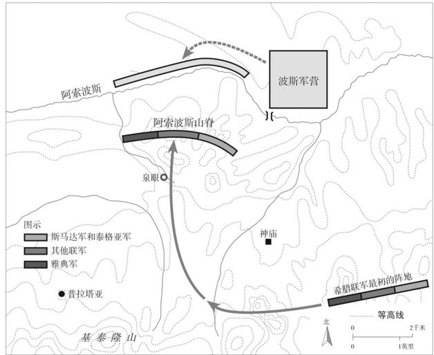 这不是一个小问题。中军的士兵们来自不同的城邦,夜间行军非常困难,他们必须穿过毫不熟悉的地形,结束撤军很快就变成一团乱麻。人人饥渴难耐,心情紧张,不出意料地错过了集结地点,到了偏西一英里的地方,几乎正好位于普拉塔亚废墟之上,他们在此“四散开随意地搭起了帐篷”。54与此同时,两翼的军队出现了更大的混乱。直到天亮的时候,雅典人和另外一侧的拉斯第蒙人与泰格亚人都尚未开始撤退。这三队人马的任务是殿后,最后却发现自己造成了联军部队撤军的混乱和拖沓,整晚仍然滞留在自己的哨位上。现在河边的鸟儿已经开始歌唱,对岸敌人营地中已经人马喧嚣。