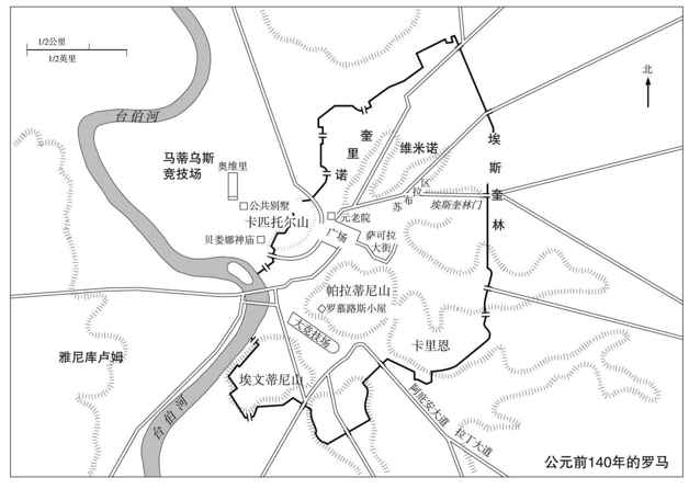 两座山中间有宽阔的山谷,别墅里的元老们与棚屋里的工匠们也有着遥远的社会距离。在罗马,财富的划分是粗线条的,就是富人和穷人,没有类似于现代中产阶级的一批人。在这种意义上,帕拉蒂尼山和埃文蒂尼山都是“岛屿”,彼此被远远地分开。另一方面,借助可追溯至罗慕路斯的一个传统,将两座山隔开的山谷其实也将它们连了起来。远到国王时代,人们便开始在大竞技场(CircusMaximus)举办双轮马车赛。它是罗马最大的公共场所,伸展在整个山谷中,一边是优雅的别墅,另一边是破败的棚屋。整个城市在这里共度节日,差不多能聚集起20万公民。迄今为止,没有任何一个体育场馆比得上。这个数字令人敬畏,证明了人们对这里的重视程度。大竞技场的观众提供了观察罗马人最好的一面镜子。通过他们发出的嘘声、欢呼声、嘲笑声,公民得到了最明白的定义。对于这一点,从别墅里观看比赛的元老们清楚,从棚屋里观看比赛的工匠们也清楚。尽管有种种界线将富人与穷人分开,共同体的观念还是将他们牢固地联系在一起。所有的公民都属于同一个共和国;无论如何,帕拉蒂尼山和埃文蒂尼山都不是真正的岛屿。