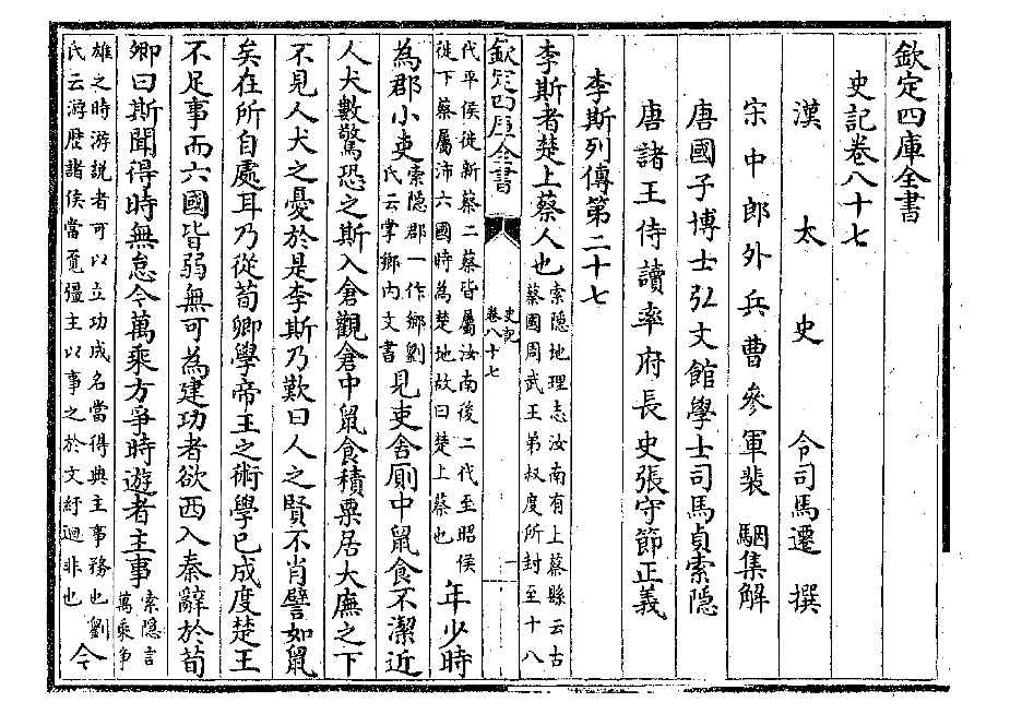 太史公叙述李斯的生平,是从一个小故事开始的。有一次,李斯在政府机关的厕所中看到几只老鼠,这些老鼠专门吃不干净的食物。这是理所当然的,厕所里头还有什么好东西可以吃呢?因为厕所中常常有人和狗进进出出(身为现代人,很难想象人与狗进同一个厕所的画面),所以厕所中的老鼠一天中常常要被惊吓好多次。