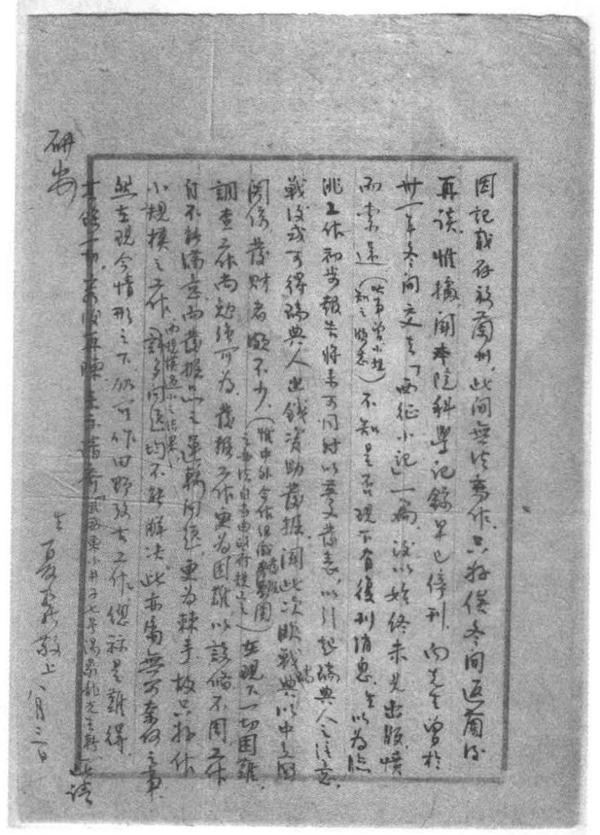 夏鼐等人西北考古的成功,也是史语所“集团研究”的结果。据不完全统计,从1944年至1945年不到两年的时间里,傅斯年李济与夏鼐等的往来电函竟达四十多封。夏鼐随时请示报告,李济件件及时回复,除了经济资助,也有奖掖与提携,如西北归来后,即向费正清推荐,“返后,适美国大使馆费正清夫人来,与李先生接洽明年普林斯顿大学二百周年纪念,李先生介绍余与之谈西北考察事,见及余之照相及画绘,颇为赞赏,暗示此类材料与上述之普林斯顿大学所要求者殊为适合”。16