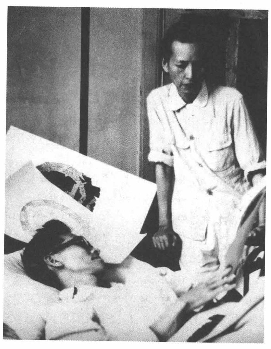 1950年,林徽因与病中的梁思成商讨国徽图案。