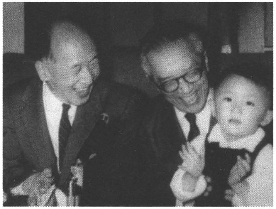 1958年,胡适从美国赴任“中研院”院长,李济在台北机场贵宾室迎接。左起李济、胡适、胡柏棠(胡适之孙)。