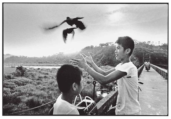 桥下溪流湍湍、四周群峰环绕;云霞后方,落日渐渐西沉,氤氲四处飘散,两只脱离掌心的鸽子腾空跃起。兄弟两人在放鸽子,极其日常的一件事,却因在瞬间被定格而呈现了极富象征意涵的人生况味。摄影的魅力就在此。