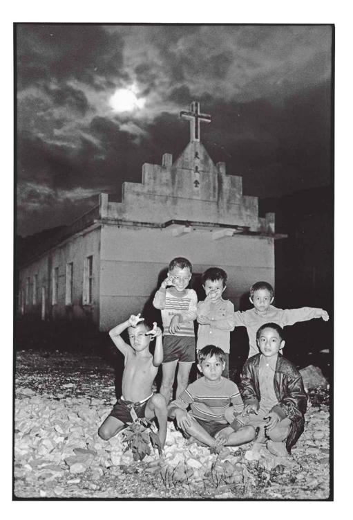 孩子们摆出自己最满意的姿势,我把相机搁在借来的板凳上,按下全开的B快门。夜空被闪光灯划破后又回复墨黑,我默念着一、二、三、四,直到十秒才松开快门。效果如何,我完全没把握。回家后进暗房,底片显影出来,看着那黑白颠反的负片影像时,我不禁感恩地欢呼——老天又送我礼物了!