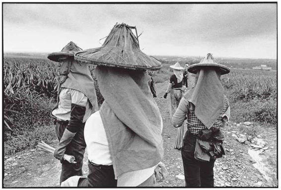 老上司们离开后,一批农妇正要上工,从人人手里握着的杆枝,可知她们是要来绑叶的。甜美的果实得之不易。一个品种从杂交授粉到育苗、选种、分类、淘汰、量产,必须经过二十年。下苗后,也至少要等十八个月才能采收。在发育过程中,为了防“日烧”而产生的病害,得一株一株地将待熟的凤梨用周围的叶子裹好、扎起来。