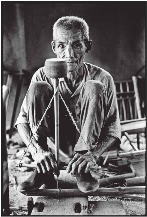 在《汉声》杂志工作期间,我拍摄的所有底片都属公司资产,一大批没有刊出的影像都尘封在不见天日的数据库里。没有回忆就没有往事;当我在构思《人与土地》展览时,这一幕深烙脑海的影像浮现眼前,但底片不在手头,只有回到离开十多年的单位,签了借条借出自己的心血。在暗房用放大机将这位竹器匠的身影投射出来时,我的眼眶都湿了。久违了,故乡的土地,故乡的人!