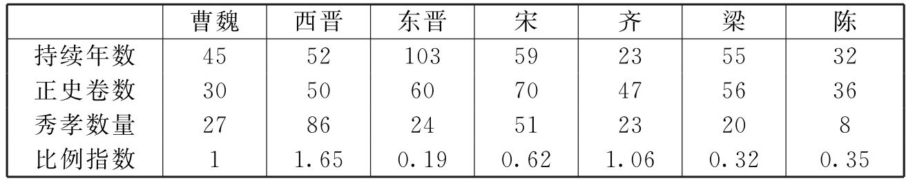 为了对见于吏传之秀孝的数量变化有一较为直观简明的印象,下面将曹魏、两晋及南朝各代之秀孝规模变化化为指数,列表以为辅助说明。由于各王朝持续时间长短不一,各代史书篇幅亦简繁大异,这里所采用的统计方法是,将各代之秀孝见于“正史”者,除以王朝之持续时间,及相应“正史”之卷数,即: