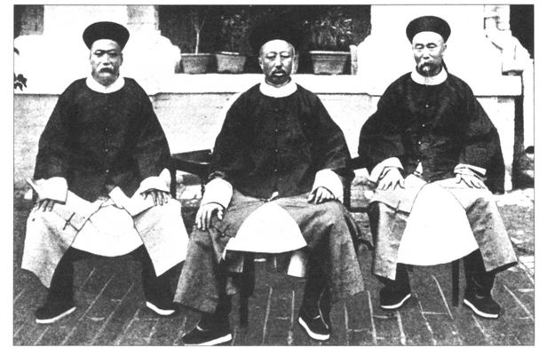 海军衙门大臣(1886)。由左至右:善庆、醇亲王、李鸿章。选自立德夫人:《熟悉的中国》(伦敦:哈钦森出版有限公司,1899),第495页。