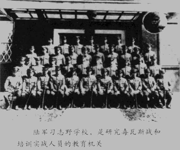 除了这个研究化学武器的陆军第六技术研究所之外,还有一个千叶习志野学校。它属于另一指挥系统,归陆军教育总监领导。这个学校在各连队分别配属一二名负责毒气工作的军官,他们是负责开展连队毒气战防护方法、防毒面具及衣服的穿着训练和消毒等教育的专门技术军官。习志野学校从全国各地和海外驻地召集这些军官进行六个月至一年的毒气防护及攻击方法的训练。