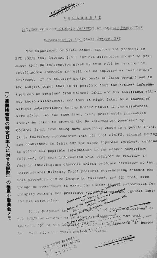鲍威尔从文件夹中拿出了一套英文文件说道:“这是我最近在美国国立挡案馆发现的1947年2月至9月期间,华盛顿参谋长联席会议和东京盟军总司令部司令麦克阿瑟之间来往的机密文件。具体地记录了华盛顿和东京之间围绕着是否把731部队长石井四郎及有关人员的身份移交给苏联问题的具体记录。长期以来,这些文件一直列为机密。现在由于实施‘情报公开法’我才搞到了手。”