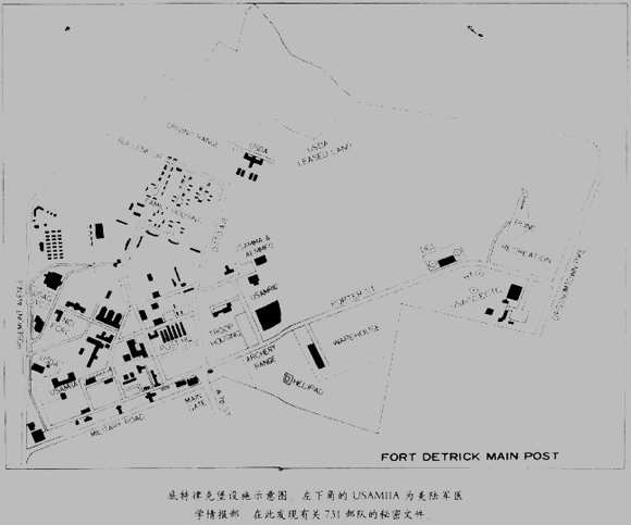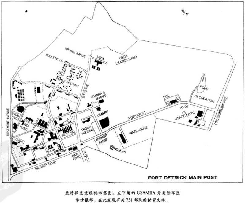 乍一看,似乎是一座某种研究设施,这里肯定是底特律克堡。它在朝鲜战争时发挥了进行细菌战大总管的作用,是美国陆军的一个要塞。这里的基地化学部长诺伯特·费尔博士在35年前曾审讯过石井四郎中将。——除这点片段的情况之外,关于底特律克堡与731部队的关系,毫无任何知晓。