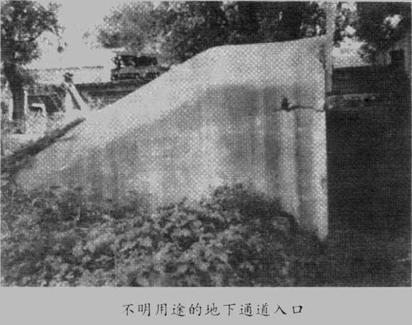 紧靠吉村班设施的附近,即“全图”中第(13)号的特别班动物房旁边有一个地壕。这个地壕的入口是一个突出地面的巨大的混凝土制的管道。